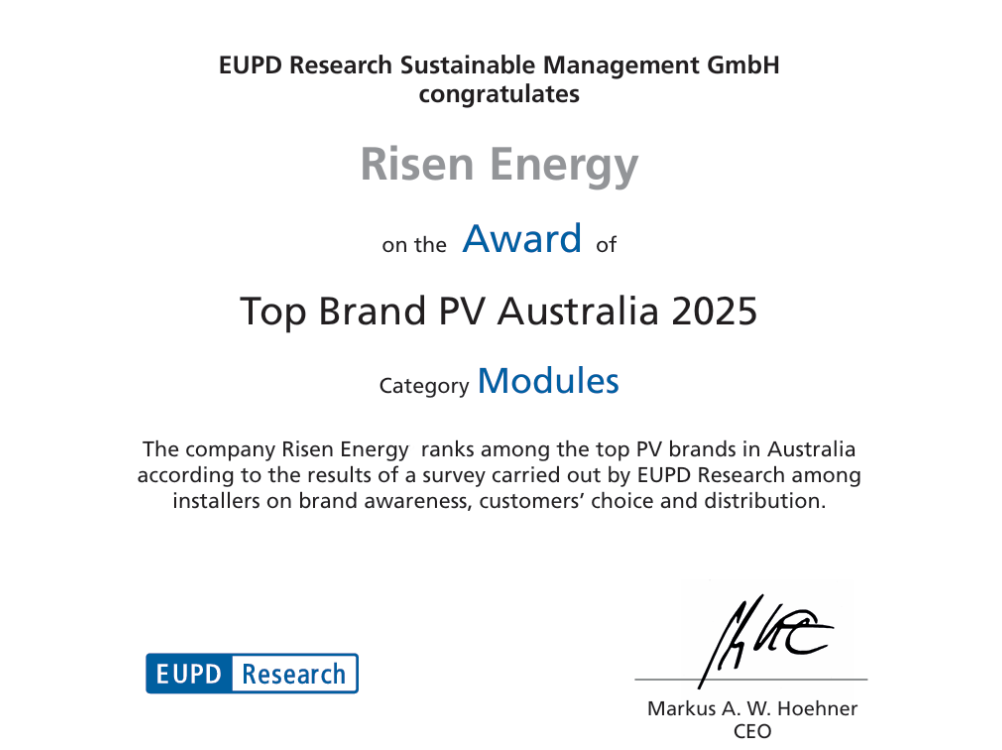 近日,全球知名市场研究机构EUPD Research公布了2025年度“澳大利亚顶级光伏组件品牌”(Top Brand PV Modules Australia 2025)评选结果。东方日升(300118)凭借出色的产品品质、持续的技术创新以及卓越的口碑,连续多年斩获这一权威殊荣。
